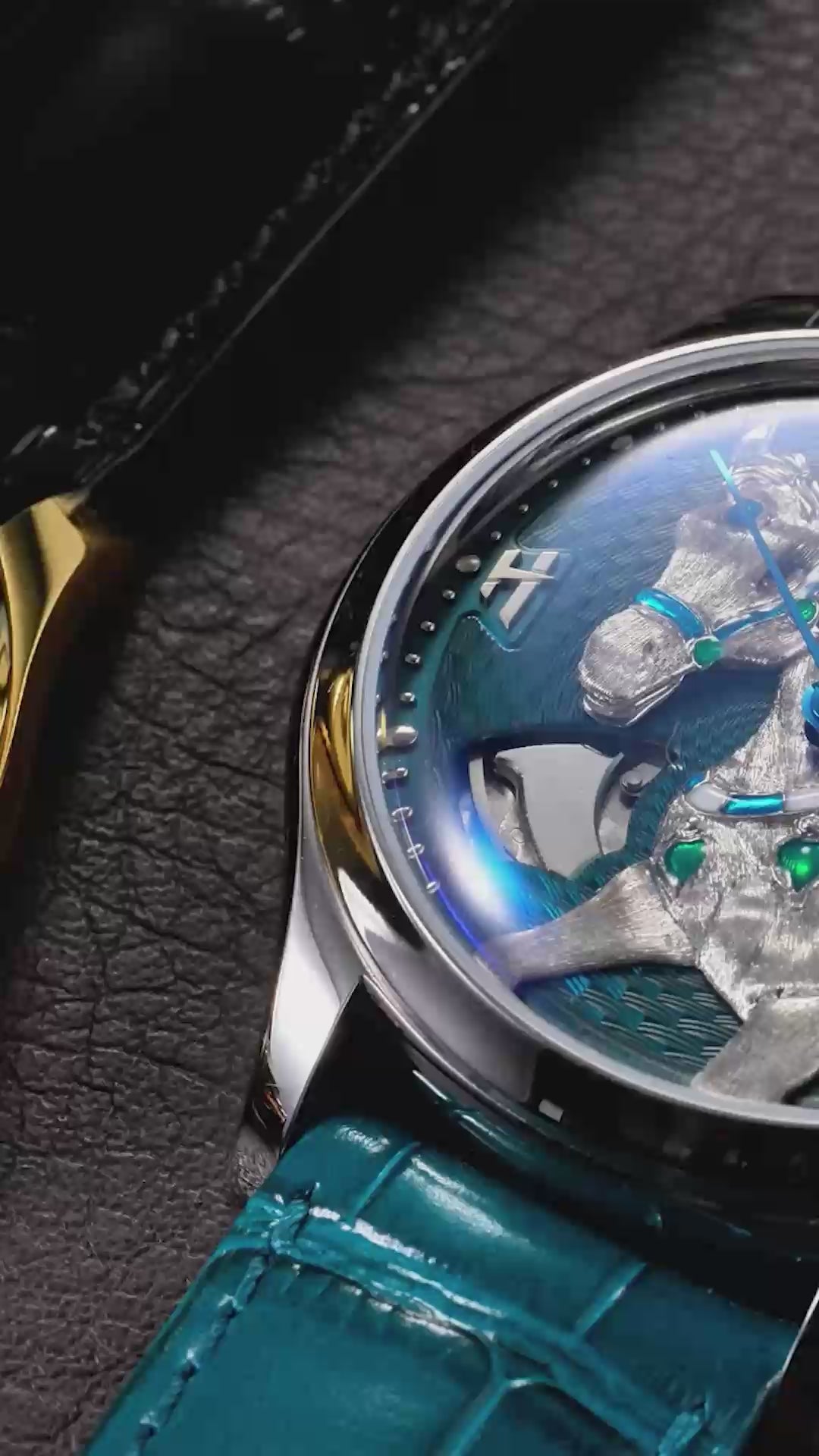 At the center of the dial is a mechanical automaton horse, designed to perform a precise and lifelike motion. When activated, the movement is accompanied by a chiming mechanism, adding a subtle acoustic layer that elevates the experience beyond traditional timekeeping.