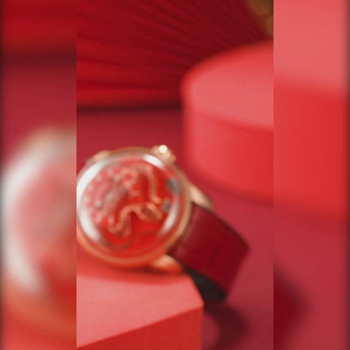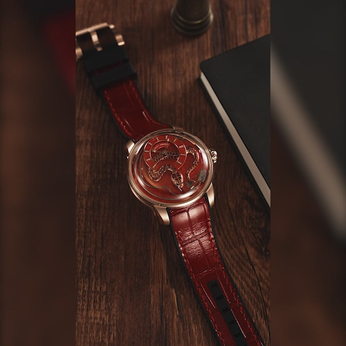 Bold and commanding, the Craftmanship Series Red Enamel Snake Automatic Chiming Watch from Lucky Harvey is a rare masterpiece—limited to just 100 pieces. This edition showcases a rich red enamel snake, hand-engraved and hand-painted, flowing over a deep guilloché dial. At every hour, the enamel snake’s tongue automatically pops out and strikes a titanium gong, producing a soft, melodic chime. This signature chiming mechanism is the watch’s standout automaton feature. With its LH012 Automatic Chiming Movement and 40 hours power reserve, it combines mechanical marvel with artistic craftsmanship. A 43 mm x 16 mm stainless steel case gives the watch a strong wrist presence. A premium fluoro-rubber + leather hybrid strap with a pin buckle fits wrists 160–185 mm, while the watch weighs a comfortable ~123 g. With 3 ATM water resistance, it handles daily exposure with ease. Red enamel variants are highly sought after by collectors who appreciate rarity and complexity. This variant combines bold aesthetics with mechanical animations.
