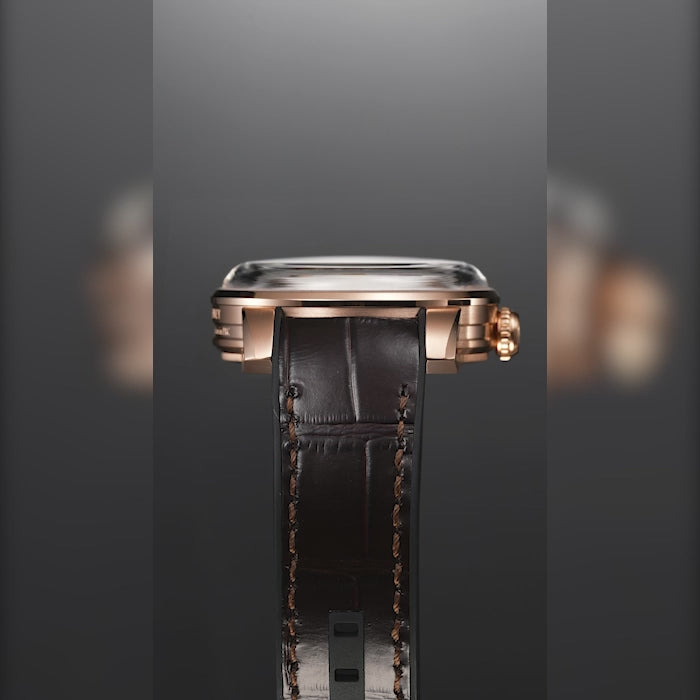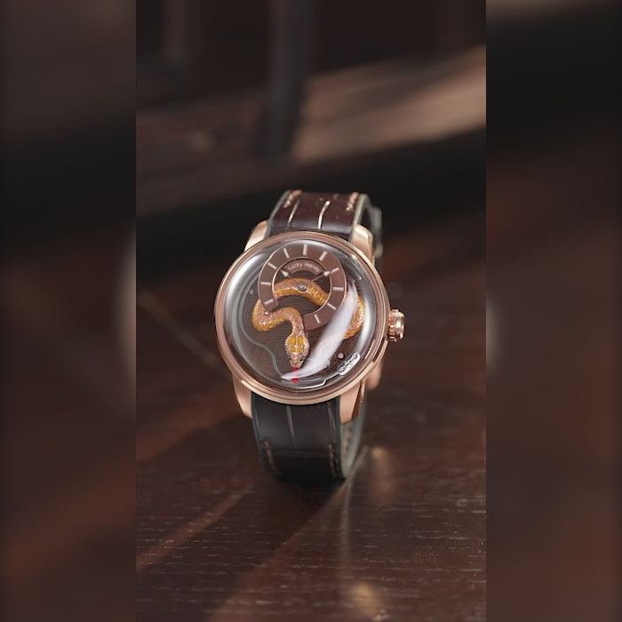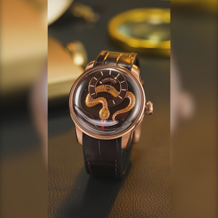 This limited edition Gold Enamel Snake Automata Chiming Watch from Lucky Harvey blends high craftsmanship with mechanical intrigue. Each of the 100 pieces features a hand-applied enamel snake motif in gold tones, coiling across a guilloché dial that captures light in elegant interplay. The automata complication animates the serpent’s tongue, which strikes the gong each hour to deliver a soft, musical chime.