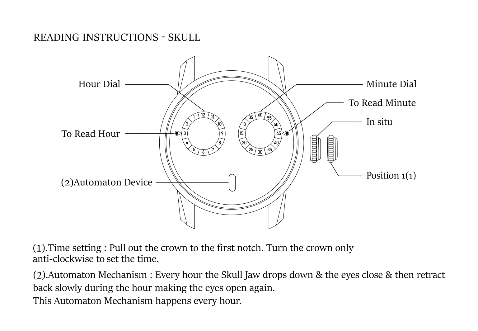 The centerpiece is a 925 pure silver skull, meticulously handcrafted and hand-painted to perfection. The design features a captivating mechanism where the left eye displays the hour, the right eye shows the minute, and the skull’s jaw at 6 o’clock gracefully moves at each hour. Additionally, the eyes subtly open and close, adding a dramatic, mesmerizing touch. This watch is a true masterpiece, blending artisanal craftsmanship with bold, avant-garde design.
