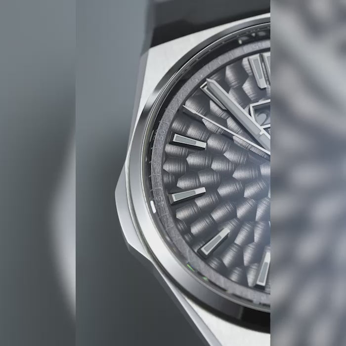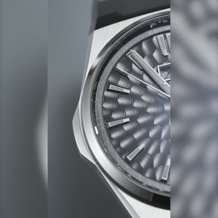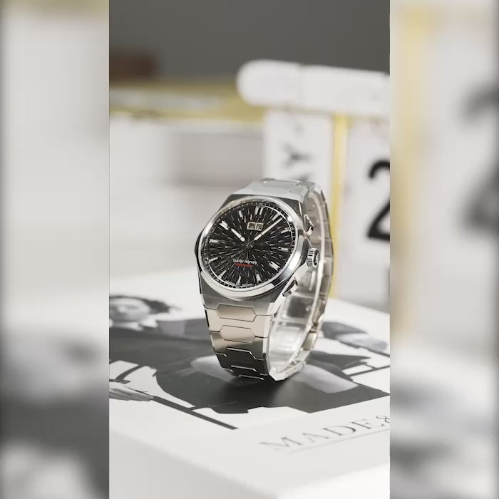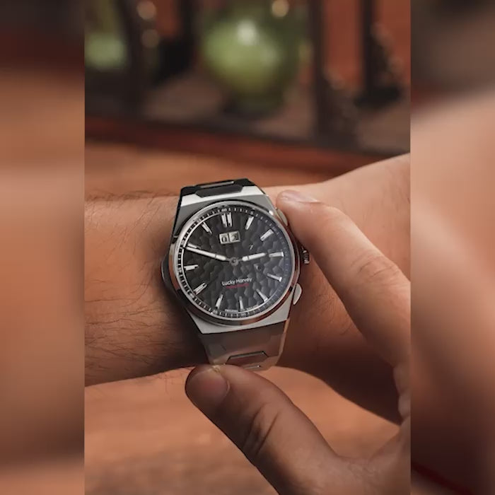 The Lucky Harvey Hammer Dial Big Date Chiming Watch in black is a striking union of texture, sound, and precision, limited to just 300 pieces. Its standout feature is the hammered “dimpled” matte black dial, which possesses subtle depth and a refined interplay of light and shadow. This textured surface is achieved via expert hammering, giving the watch a tactile, living quality.