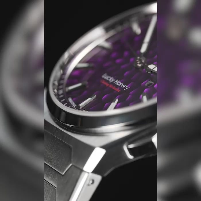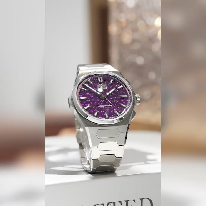 The Lucky Harvey Hammer Dial Big Date Chiming Watch in purple is an extraordinary timepiece, released in a limited run of 300 pieces. Its striking hammered “dimpled” dial is awash in rich purple, giving it a luxurious, artistic character that shifts beautifully under different light. This textured surface is crafted via delicate hammering techniques, combining tradition with contemporary flair.