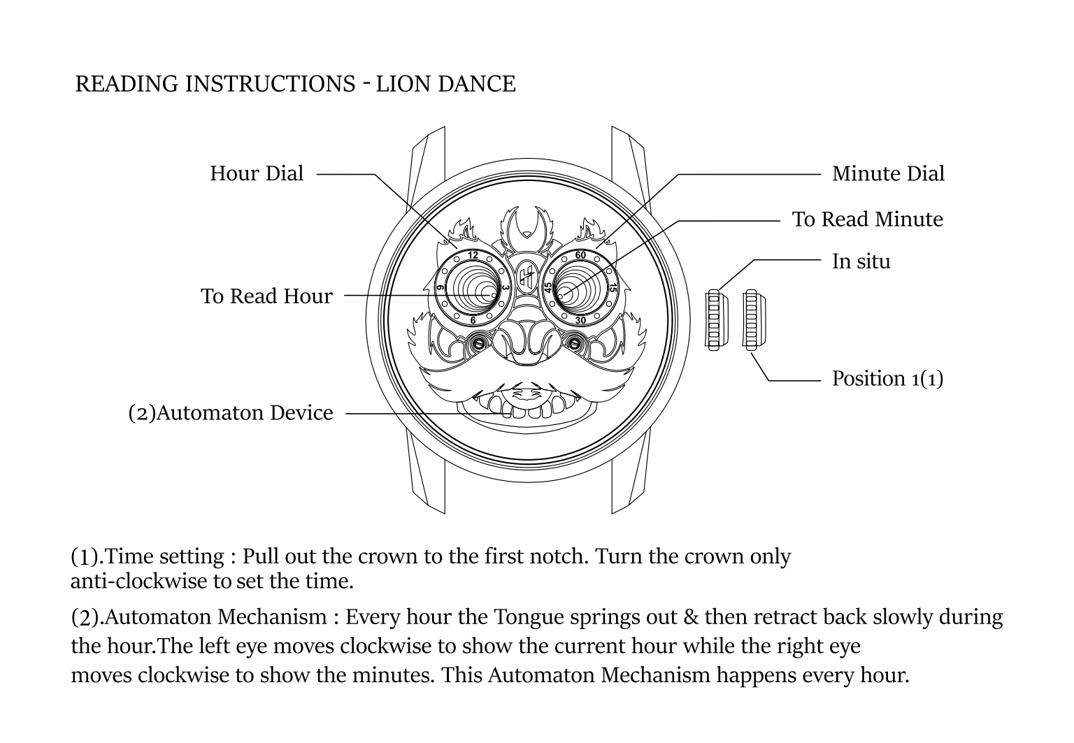 At the heart of this timepiece is an automatic movement, enhanced by an intricately polished rotor designed to resemble the classic lion dance movement. This innovative feature seamlessly combines tradition with modern horology, symbolizing confidence and cultural depth. The dial's left eye displays the hour, while the right eye marks the minutes, creating a captivating and functional design. This watch is a perfect representation of elegance and craftsmanship.